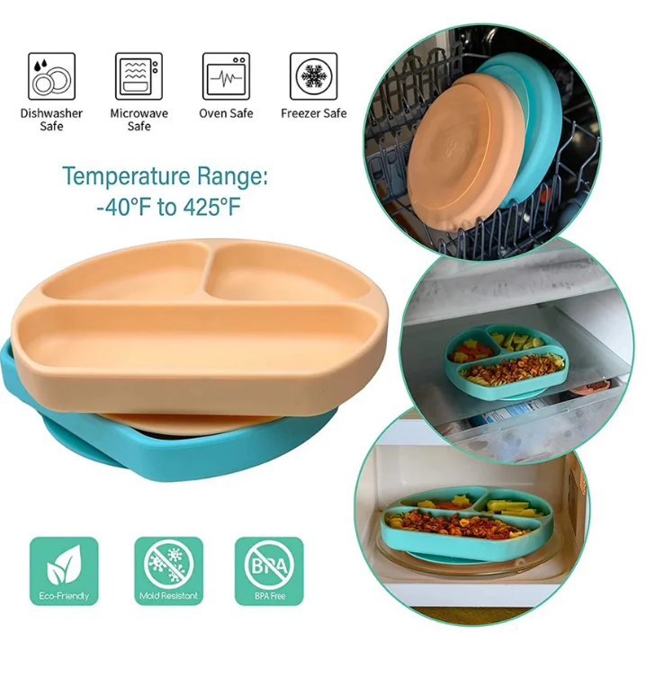 Facilita la hora de comer con este plato de silicona con separadores y ventosa, ideal para mantener la comida organizada mientras haces de la alimentación un momento divertido para tus pequeños.